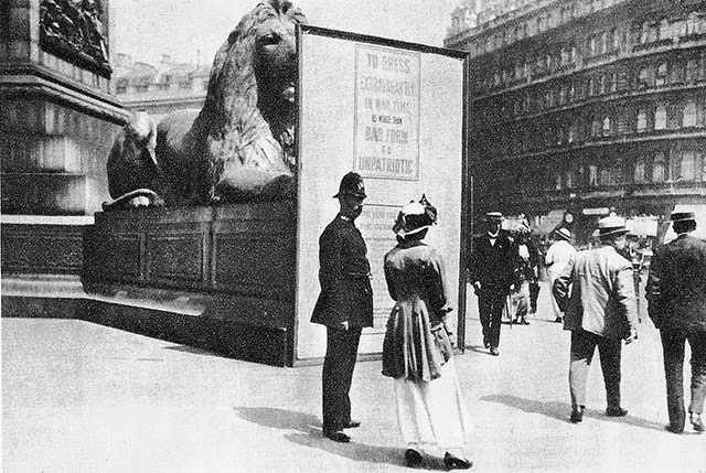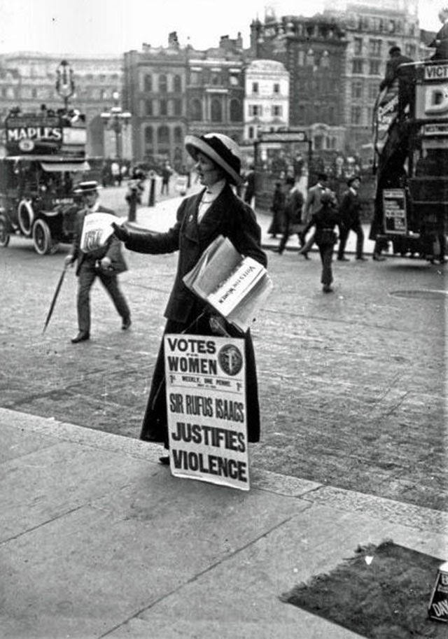 | The suffragette is selling the ‘Votes for Women’ newspaper outside Morley’s Hotel in Trafalgar Square, in the background is the newly built Admiralty Arch and the entrance to the new Trafalgar Square underground station. The ‘Votes for Women’ newspaper was one of several suffragette newspapers published during the early years of the 20th century, this particular edition which paraphrased the Solicitor General at the time, was published on Friday 29th April 1910. |