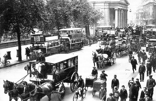 | A pre 1926 photograph of an early June scene on the north side of Trafalgar Square. A London taxi cab parked in front of bus both facing the wrong way so it must be before the gyratory system was introduced in 1926. |