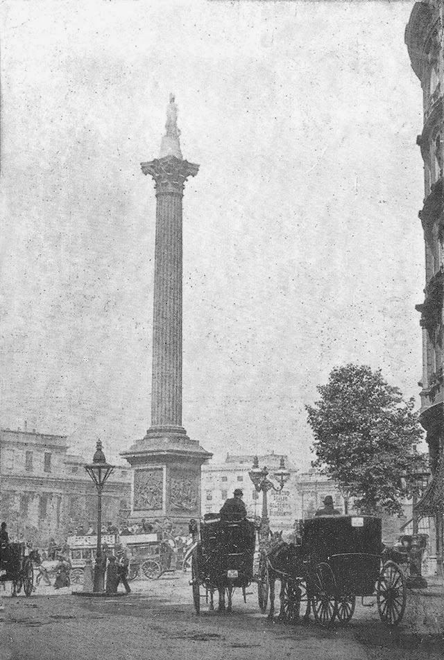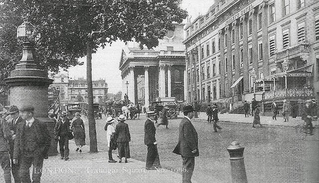 | A view of the Grand Hotel across the southeastern corner of Trafalgar Square, circa 1910. |