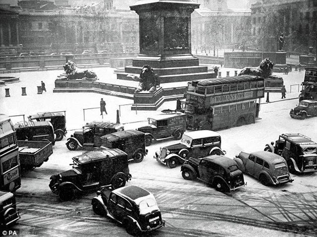 | This is how the worst winter in living memory affected Trafalgar Square during one rush hour. The 1946-1947 winter brought chaos and further misery to a country still on the ration with bread prices increasing even after two years of peace. |