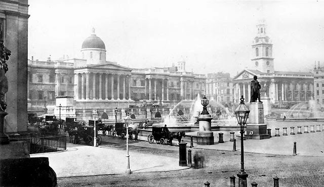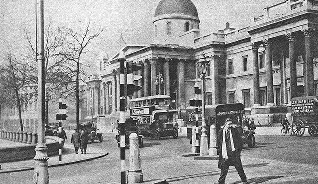 An early 1930s photograph of the north east corner of Trafalgar Square with the National Gallery in the background. |