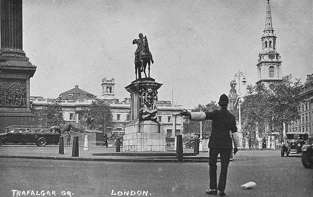 The bus stops on the south side of Trafalgar Square were removed when the gyratory system was introduced in 1926. |